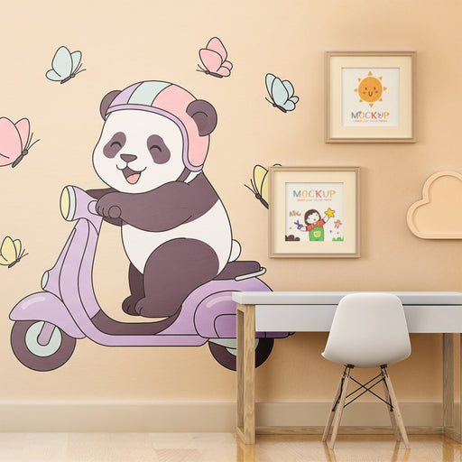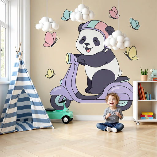 Afficher tous les détailsPapier peint chambre enfant | Panda joyeux en scooter avec des papillons