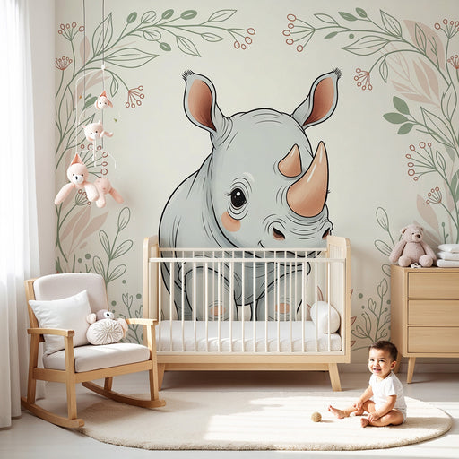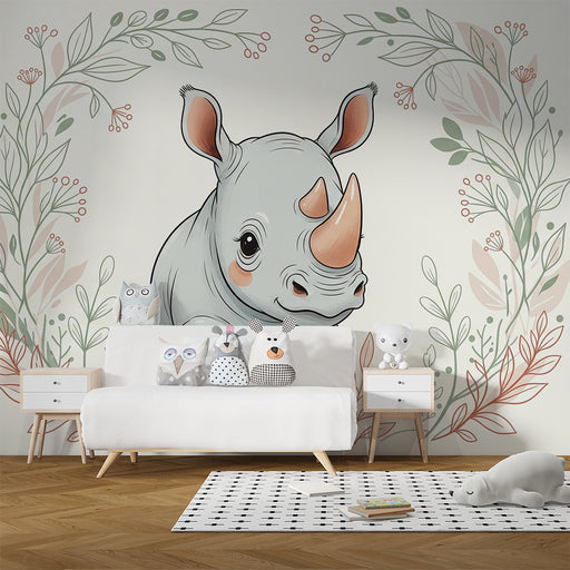 Afficher tous les détailsPapier peint chambre bébé | Mignon rhinocéros entouré de feuillage délicat