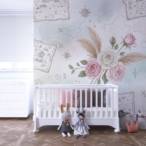 Afficher tous les détailsPapier peint chambre bébé | Cartes au trésor et roses délicates dans des tons pastel