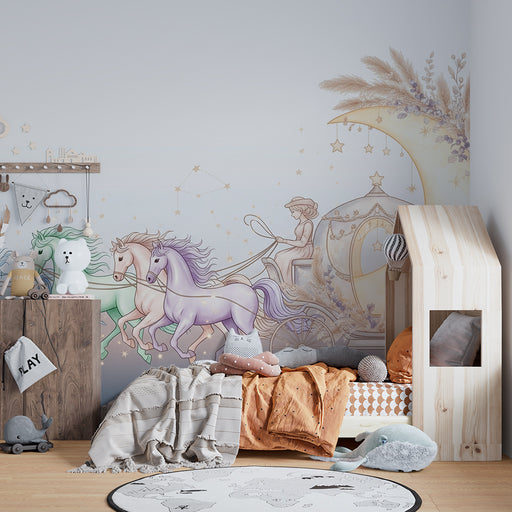 Papier peint chambre bébé | Carrosse magique et chevaux colorés sous les étoiles