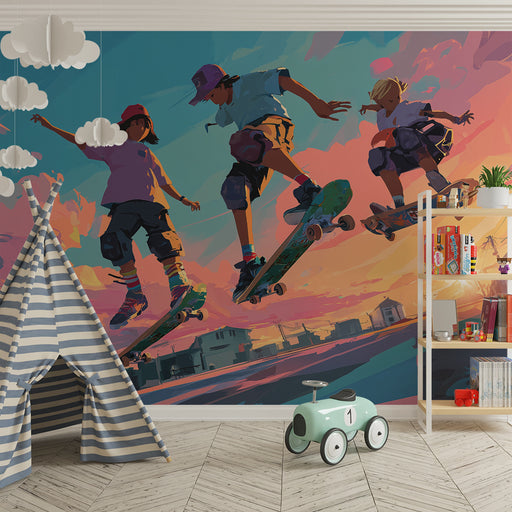 KidsWallCe papier peint skateboard capture l'énergie et la liberté de la jeunesse avec une illustration vibrante de trois skateboarders défiant la gravité ...