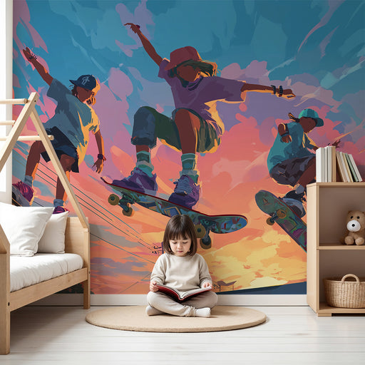 KidsWallCe papier peint skateboard capture l'énergie dynamique et la vitalité des skateurs en pleine action sous un ciel de crépuscule éclatant. Les couleu...