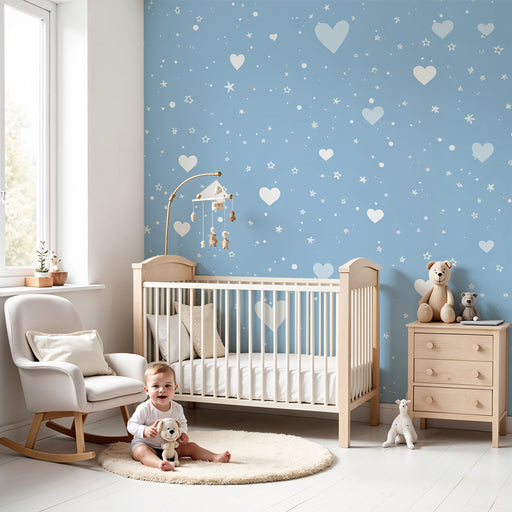 KidsWallAjoutez une touche de tendresse à votre espace avec notre papier peint cœurs et étoiles sur fond bleu pastel. Ce motif délicat présente de charmant...