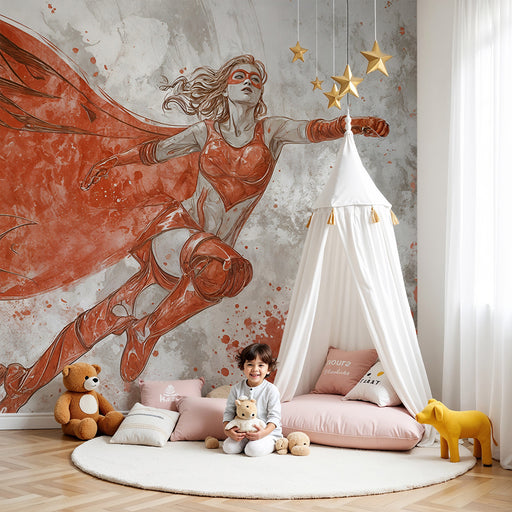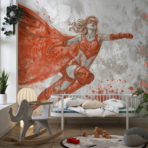Égayez vos murs avec ce papier peint super-héros, représentant une héroïne dynamique volant à travers une toile d'éclaboussures artistiques rouges ...