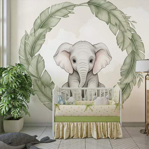 Transformez la chambre de votre bébé en un espace cocooning avec ce papier peint pour bébé mettant en scène un adorable éléphant entouré de feuille...