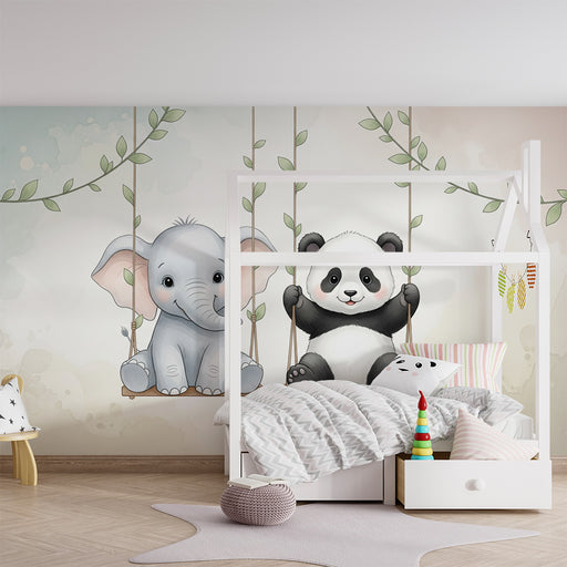 Papier peint chambre bébé | Éléphant et panda sur des balançoires