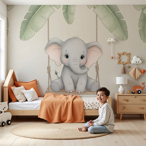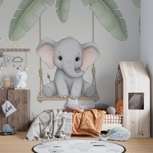 Transformez la chambre de votre bébé en un doux sanctuaire avec ce papier peint pour bébé représentant un adorable éléphant perché sur une balançoi...