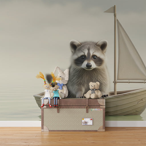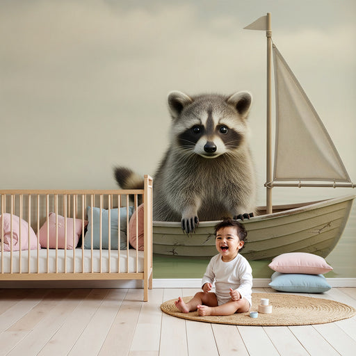 Embarquez pour une aventure maritime avec ce papier peint pour enfants mettant en scène un adorable raton laveur naviguant sur un petit bateau. Ce ...