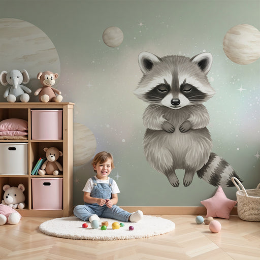 Invitez votre enfant à un voyage intergalactique avec ce papier peint pour chambre d'enfant mettant en scène un adorable raton laveur flottant parm...