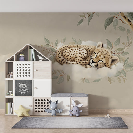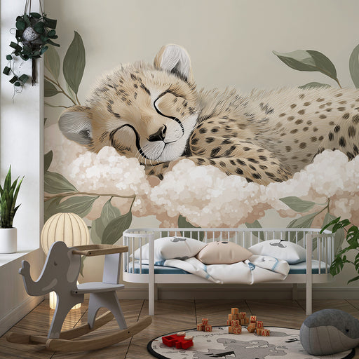 Afficher tous les détailsPapier peint chambre bébé | Petit guépard endormi sur un nuage avec des feuilles délicates