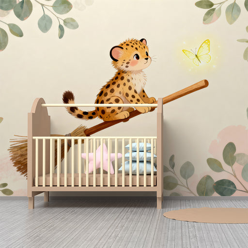 Papier peint chambre bébé | Petit léopard sur un balai avec un papillon lumineux
