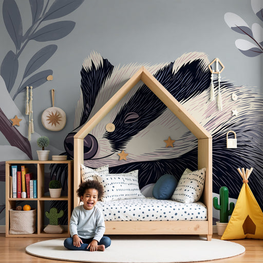 KidsWallTransformez la chambre de votre enfant en un havre de paix avec ce papier peint pour enfants représentant un blaireau endormi sur une branche, ento...