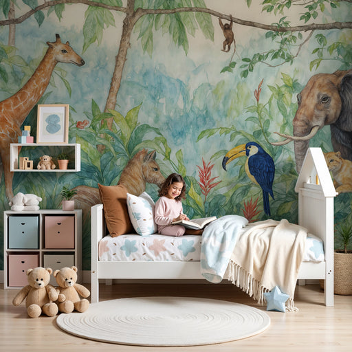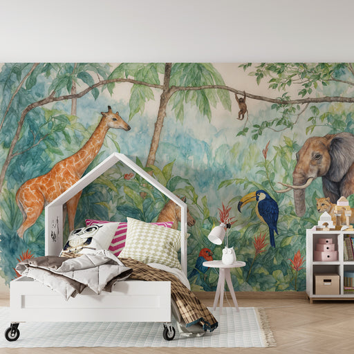 Ce papier peint jungle présente une superbe illustration aquarelle d'animaux exotiques dans leur habitat naturel. Idéal pour créer une ambiance ave...