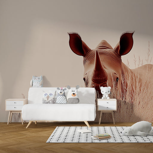 Transformez la chambre de votre enfant avec ce papier peint pour enfants représentant un rhinocéros curieux se cachant dans une savane paisible. Le...