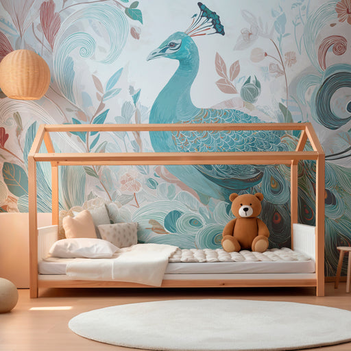 Papier peint chambre enfant | Paon élégant et fleurs naturelles