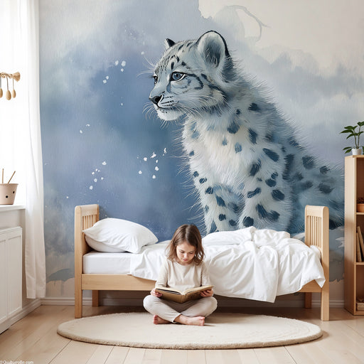 Transformez la chambre de votre enfant en un véritable royaume des neiges avec ce papier peint pour enfants représentant un jeune léopard des neige...