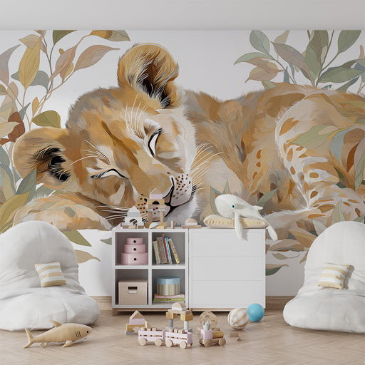 Papier peint chambre bébé | Lionceau endormi entouré de feuillage doux
