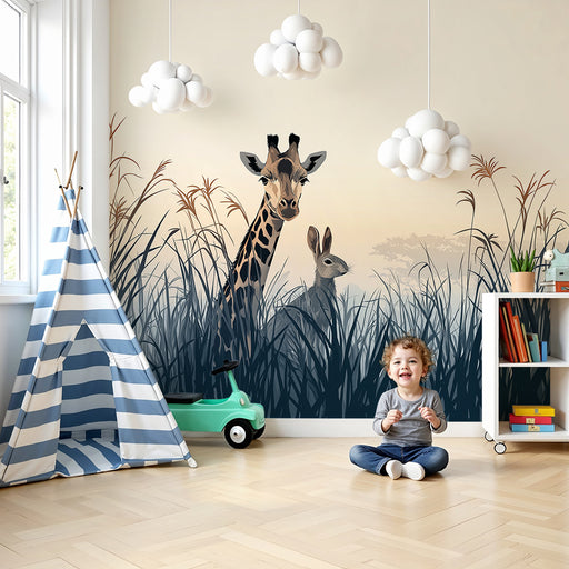 KidsWallTransformez la chambre de votre enfant en un havre de paix avec ce papier peint pour enfants représentant une girafe majestueuse et un lapin curieu...
