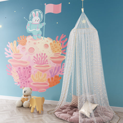Afficher tous les détailsPapier peint chambre enfant | Lapin astronaute sur une planète colorée avec coraux