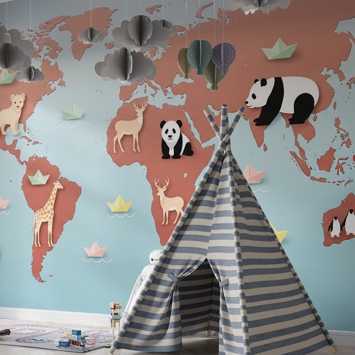 KidsWallTransformez la chambre de votre enfant en un voyage autour du monde avec ce papier peint pour enfants illustrant une carte du monde peuplée d'anima...
