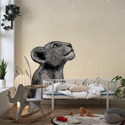 Papier peint chambre enfant | Petit lion contemplatif sous un ciel étoilé