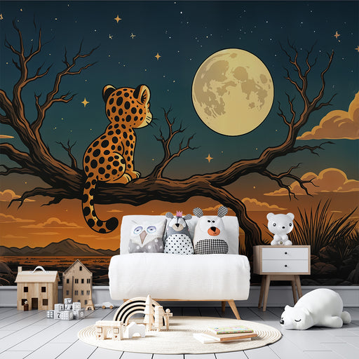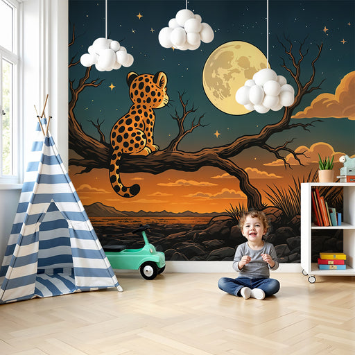 KidsWallApportez une touche magique à votre intérieur avec notre papier peint safari représentant un adorable léopard observant la pleine lune depuis une b...