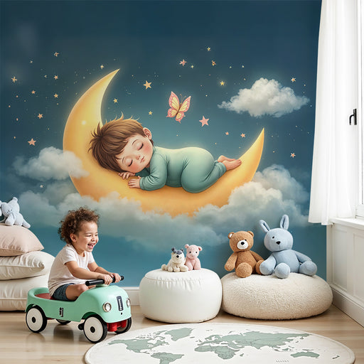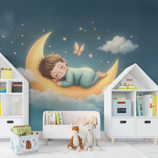 KidsWallCe papier peint bébé lune présente une scène adorable d'un bébé endormi sur une lune, entouré de nuages et d'étoiles apaisantes. Parfait pour créer...