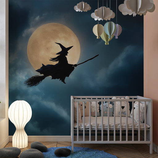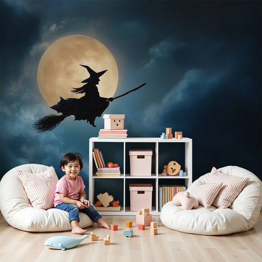 KidsWallCe papier peint sorcière capture une scène mystique avec une silhouette de sorcière volant sur son balai devant une lune brillamment éclairée. Les ...