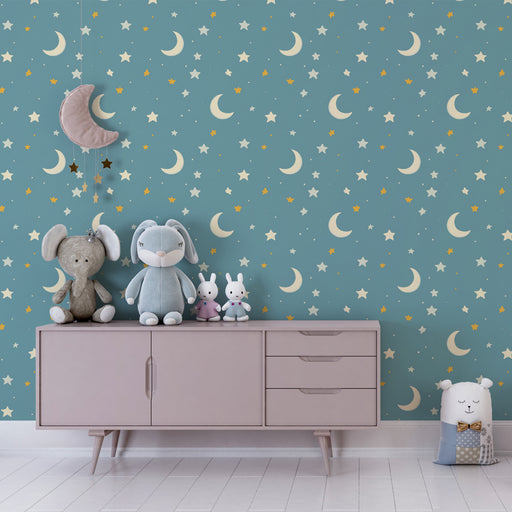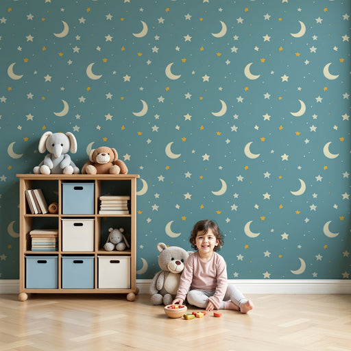 KidsWallInvitez la magie de la nuit dans la chambre de votre enfant avec ce papier peint pour chambre d enfant, orné de lunes délicates et d étoiles scinti...