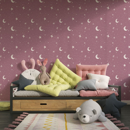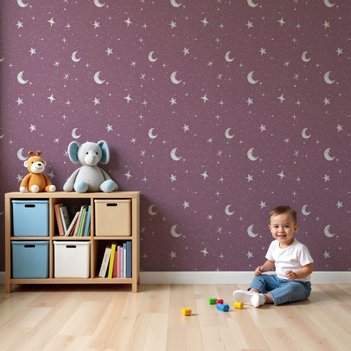 KidsWallOffrez à votre enfant un univers magique avec notre papier peint à motifs de ciel étoilé et croissants de lune sur un fond mauve apaisant. Ce desig...