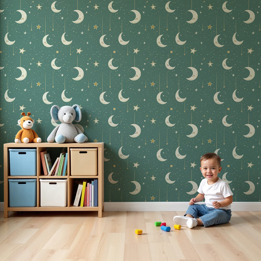 Afficher tous les détailsPapier peint chambre enfant à motifs | Lune et étoiles dorées sur fond vert