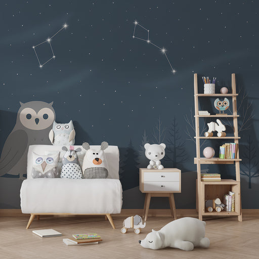 KidsWallEmbarquez votre enfant dans une aventure nocturne avec ce papier peint pour enfants représentant des oursons observant les constellations sous un c...