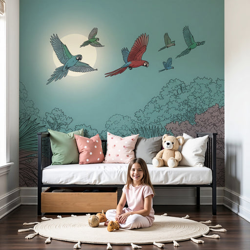 KidsWallTransformez la chambre de votre enfant en un véritable sanctuaire tropical avec ce papier peint pour enfants mettant en scène des perroquets coloré...