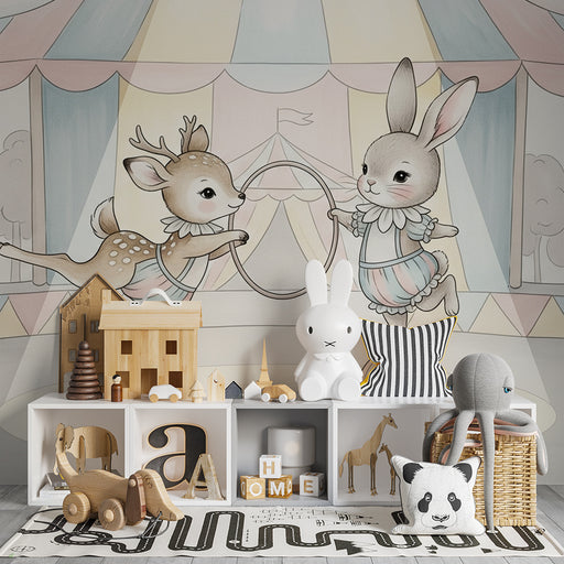 Afficher tous les détailsPapier peint chambre enfant | Spectacle de cirque avec un cerf et un lapin