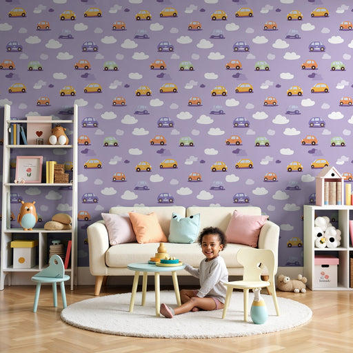KidsWallOffrez à votre enfant un univers enchanteur avec notre papier peint aux motifs de voitures colorées et de nuages joyeux. Ce design captivant, aux t...