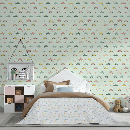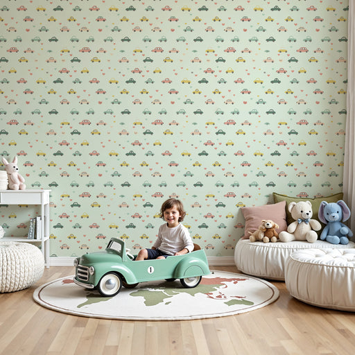 KidsWallTransformez la chambre de votre enfant avec ce papier peint pour chambre d enfant captivant, où des petites voitures aux teintes pastel roulent joy...