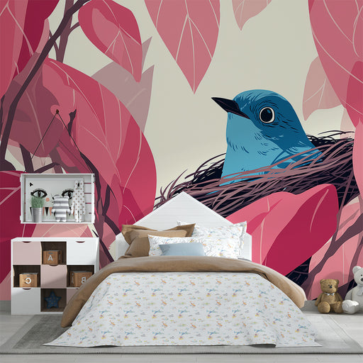 Afficher tous les détailsPapier peint chambre bébé | Oiseau bleu dans son nid entouré de feuilles roses
