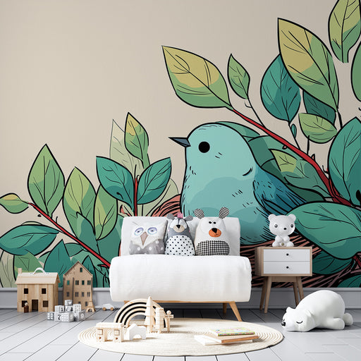 Afficher tous les détailsPapier peint chambre bébé | Oiseau dans son nid entouré de feuillage coloré