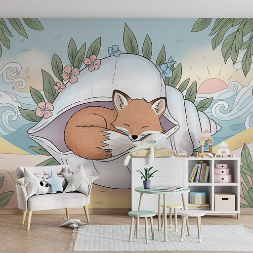 KidsWallCréez un univers doux et apaisant pour votre bébé avec ce papier peint pour chambre de bébé représentant un adorable renard blotti dans une coquill...