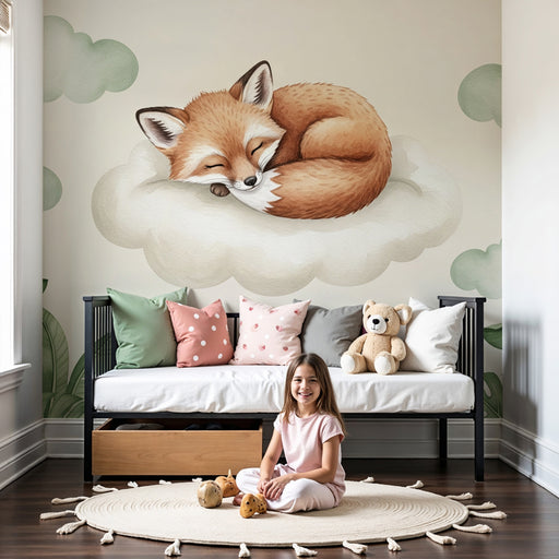 KidsWallDesignez la chambre de votre enfant avec ce papier peint pour bébé charmant, mettant en vedette un renard adoré paisiblement endormi sur un nuage m...