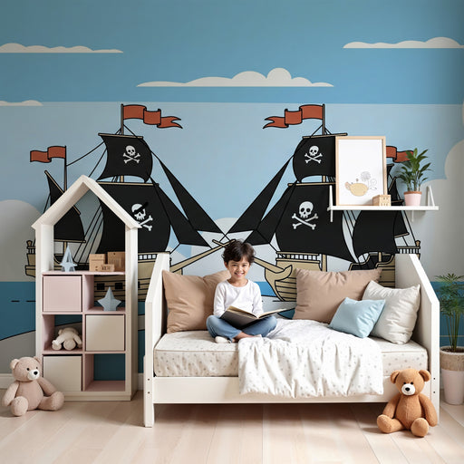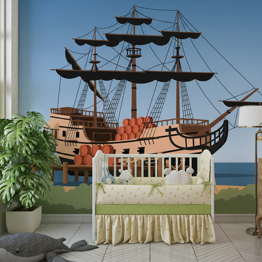 KidsWallÉveillez l'esprit d'aventure de votre enfant avec ce papier peint pour chambre d'enfant illustrant un majestueux navire pirate voguant sur des eaux...