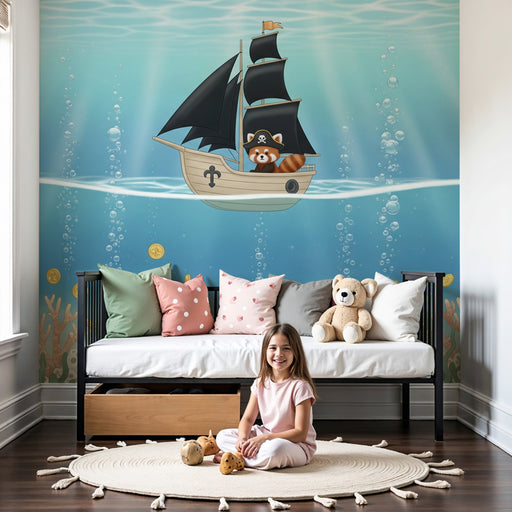 KidsWallEmbarquez pour une aventure aquatique avec ce papier peint pour enfants coloré, mettant en scène un adorable panda rouge habillé en pirate, navigua...