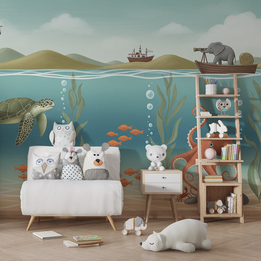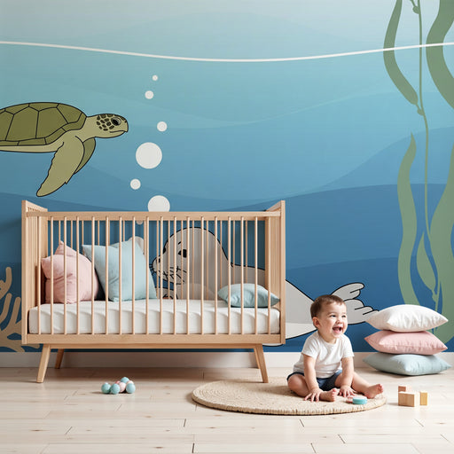 KidsWallPlongez dans l'univers fascinant des océans avec ce papier peint pour enfants qui met en scène une tortue curieuse et un phoque joueur. Sous une su...
