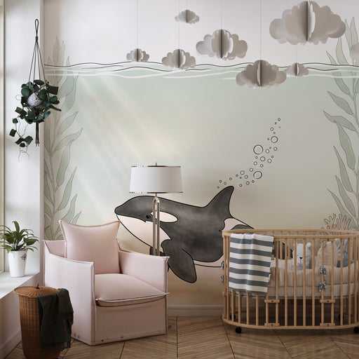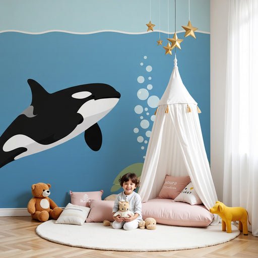 KidsWallEmbarquez votre enfant pour une aventure aquatique avec ce papier peint pour enfants représentant une orque majestueuse évoluant dans un monde sous...