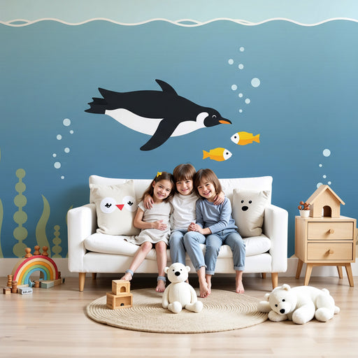 KidsWallPlongez dans un univers marin fascinant avec ce papier peint pour enfants illustrant un pingouin intrépide explorant son habitat aquatique. Entouré...