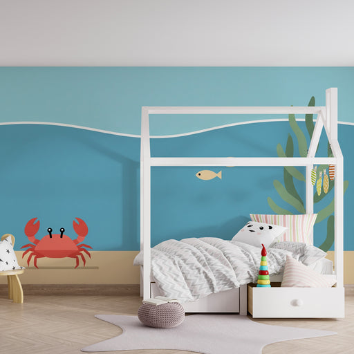 KidsWallPlongez dans un monde marin captivant avec ce papier peint pour enfants conçu pour éveiller l'imagination. Au fond de l'océan, un crabe joyeux se d...