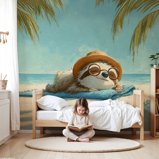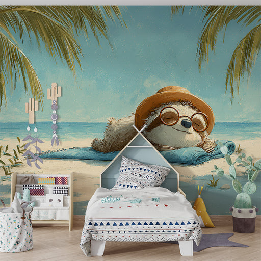 KidsWallCe papier peint avec un paresseux vous transporte dans un paradis tropical. Avec un adorable paresseux portant un chapeau et des lunettes de soleil...