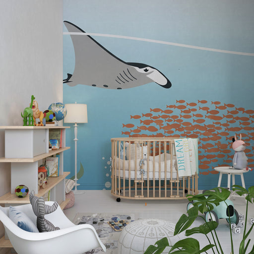 KidsWallPlongez dans un univers aquatique enchanteur avec ce papier peint pour chambre de bébé, où une tortue majestueuse nage paisiblement parmi des poiss...