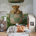 Le lionceau, curieux et espiègle, observe le monde depuis son panier suspendu, entouré de feuilles de palmier luxuriantes qui ajoutent une touche tropicale à l'ensemble. Les couleurs douces et apaisantes créent une atmosphère chaleureuse, idéale pour le sommeil et les rêves d'aventure.