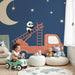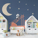 Les teintes douces de bleu et d'orange apportent une touche chaleureuse, tandis que les bâtiments stylisés ajoutent une dimension ludique à la décoration. Ce décor enchanteur stimule l'imagination des tout-petits et les invite à rêver d'aventures nocturnes.